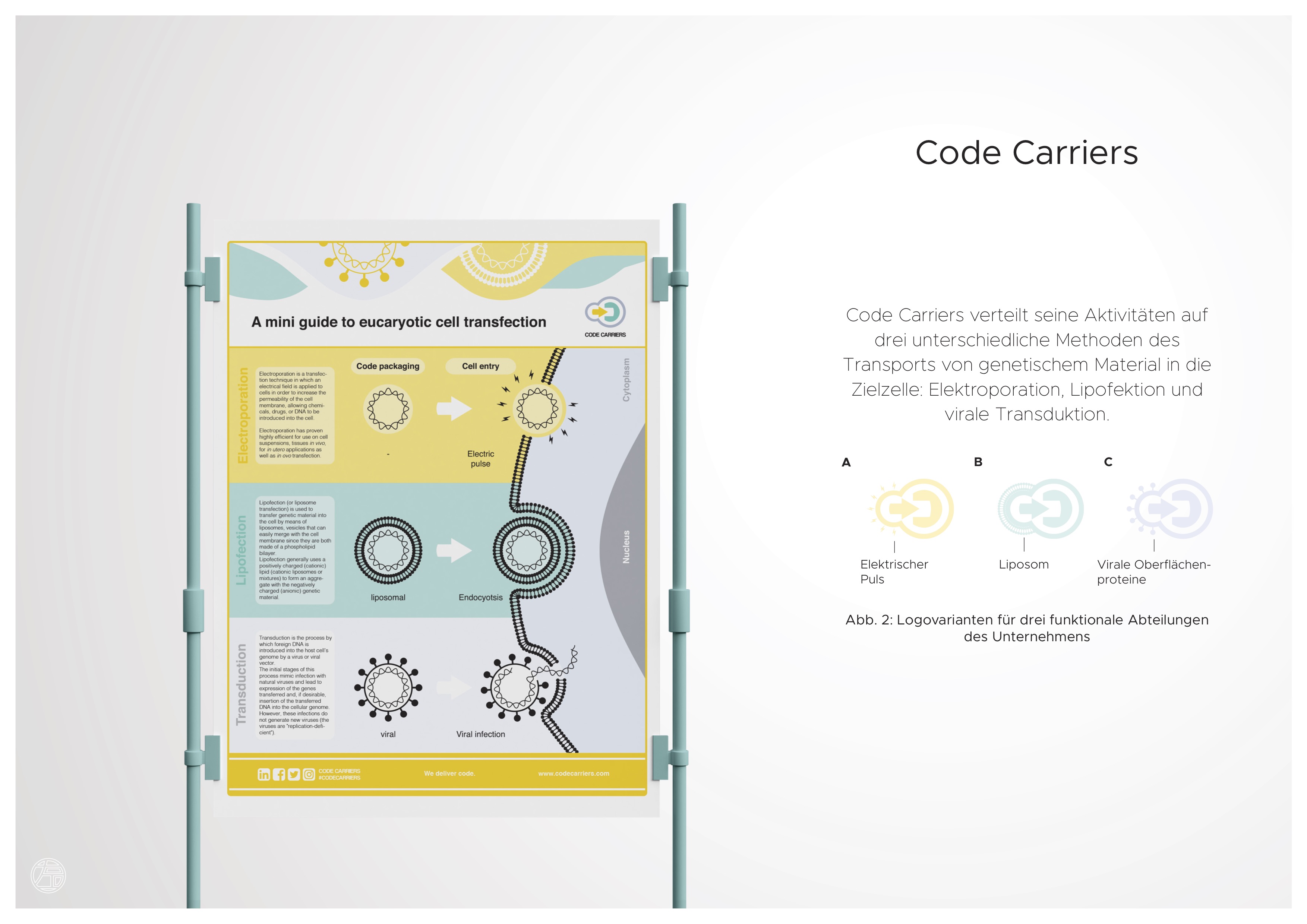 code carriers focuses its efforts on delivering foreign DNA to eukaryotic cells by using three different techniques: lipofection, viral transduction, and electroporation. The main code carriers logo can be modularized using features of each technique attached to the logo: a lipid bilayer, viral surface proteins, and icons indicating an electric pulse.